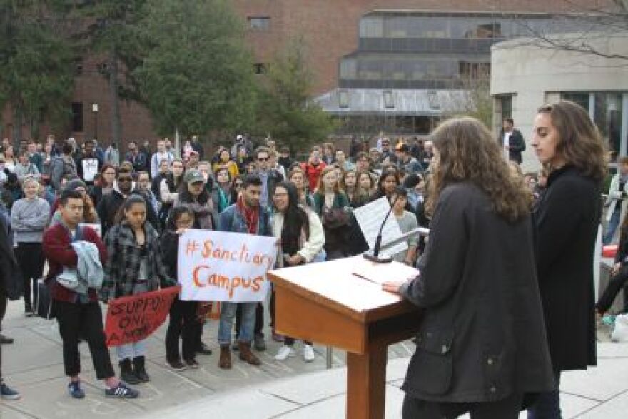 The 200 or so demonstrators at the Geneva campus called on the colleges to stand with colleges and universities across the country who are actively investigating ways through which their respective campuses can be made into what are being called sanctuary spaces, places where immigration authorities would not be able to remove undocumented immigrants.