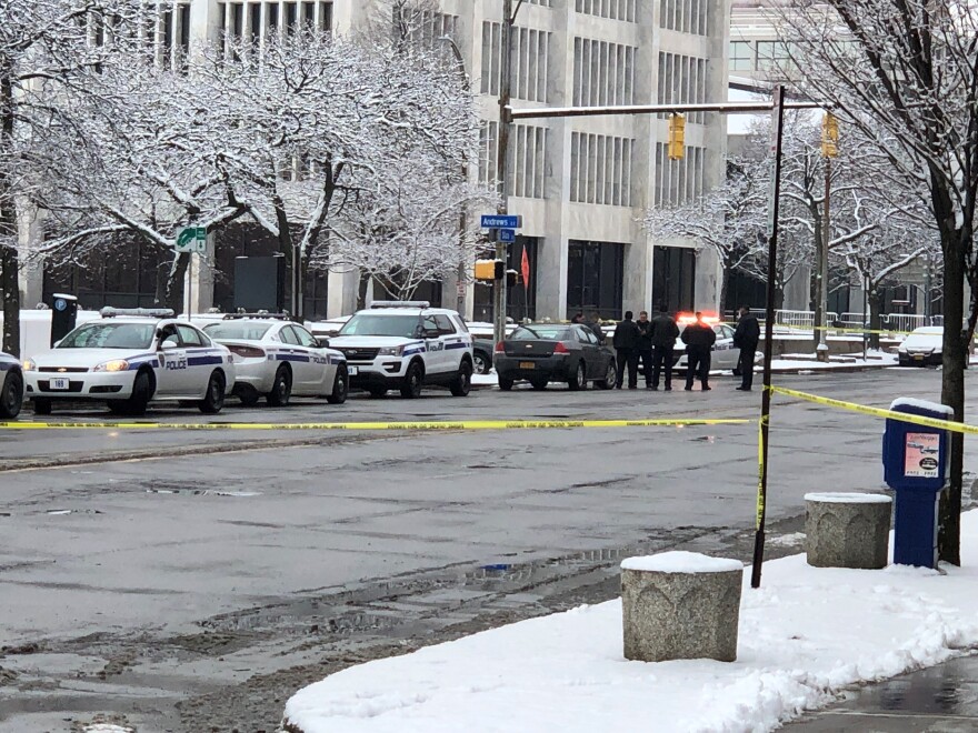 Rochester Police cordoned off several blocks near that building and the nearby Holiday Inn, and traffic along State Street was backed up onto Lake Avenue, with cars being diverted onto ramps at the Inner Loop.